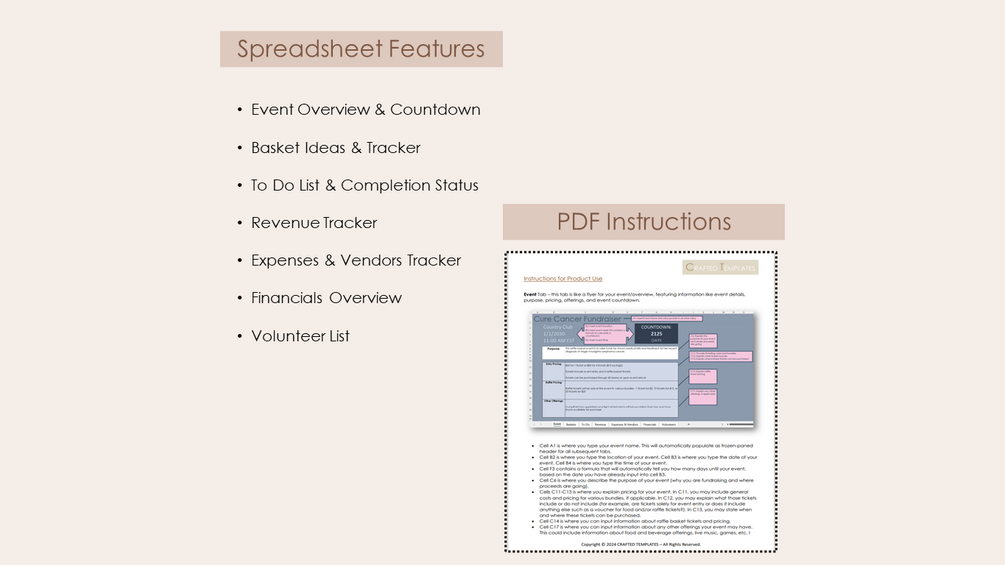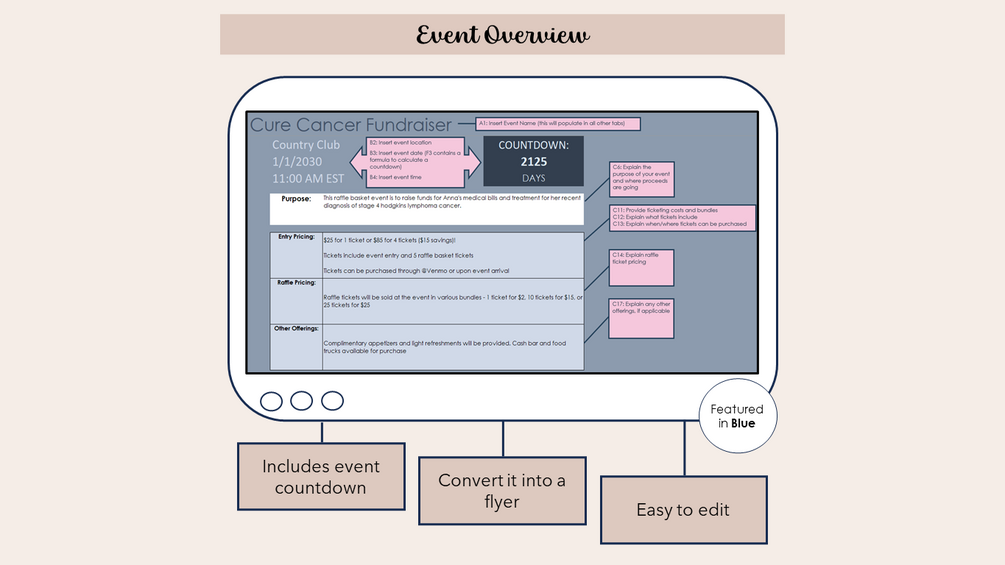 This Raffle Basket Fundraiser Excel Spreadsheet will help you plan, organize, manage, and track all things essential for your event with instant download.