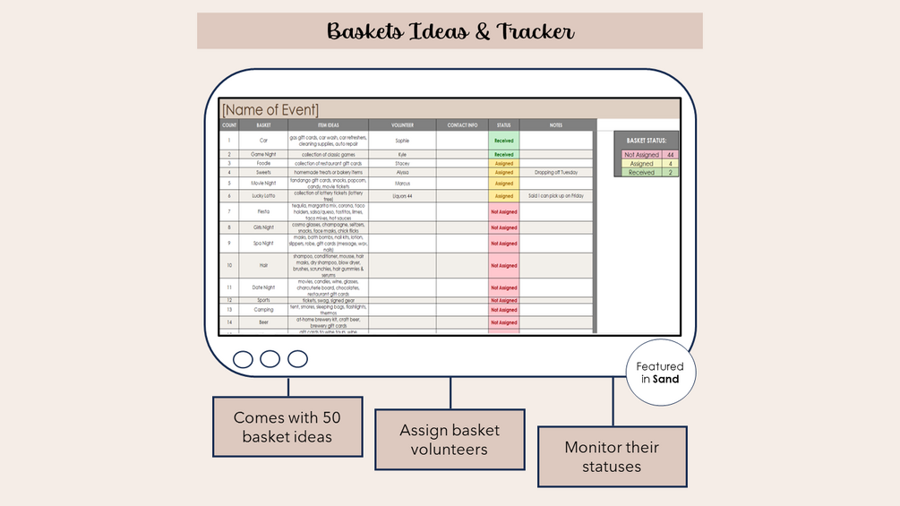 · Basket Ideas & Tracker (50 basket ideas included, assign volunteers, track statuses)