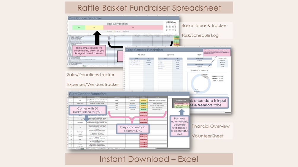 This Raffle Basket Fundraiser Excel Spreadsheet will help you plan, organize, manage, and track all things essential for your event with instant download.